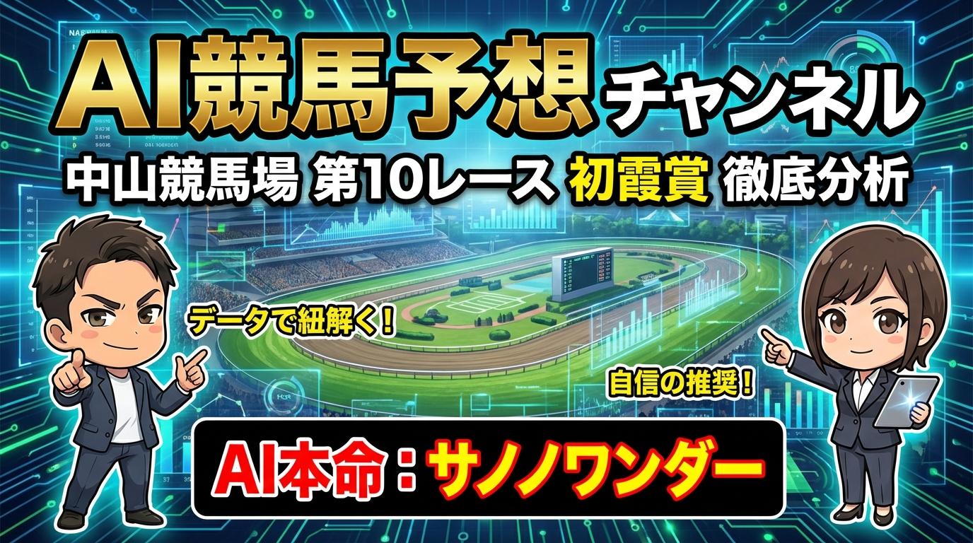 2026年1月24日、中山競馬場で開催される「初霞賞」のAI予想をお届けします。タフな中山ダート1800mを舞台に、サノノワンダー、プルナチャンドラ、フィールオーサムの三強が激突。血統、調教、展開シミュレーションから、AIが導き出した最終結論と注目馬を徹底解説します。