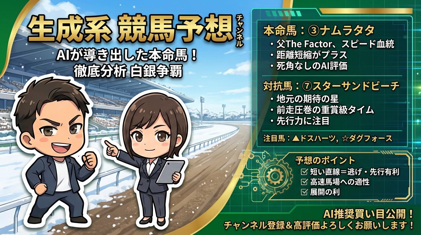 2026年1月22日、笠松競馬場で開催される第31回白銀争覇。兵庫からの実力馬ナムラタタ、笠松の超新星スターサンドビーチを筆頭に好メンバーが集結。AIが血統・適性・展開を徹底分析し、高配当の使者となりうる特注馬まで完全網羅。この記事で最終結論を掴んでください。