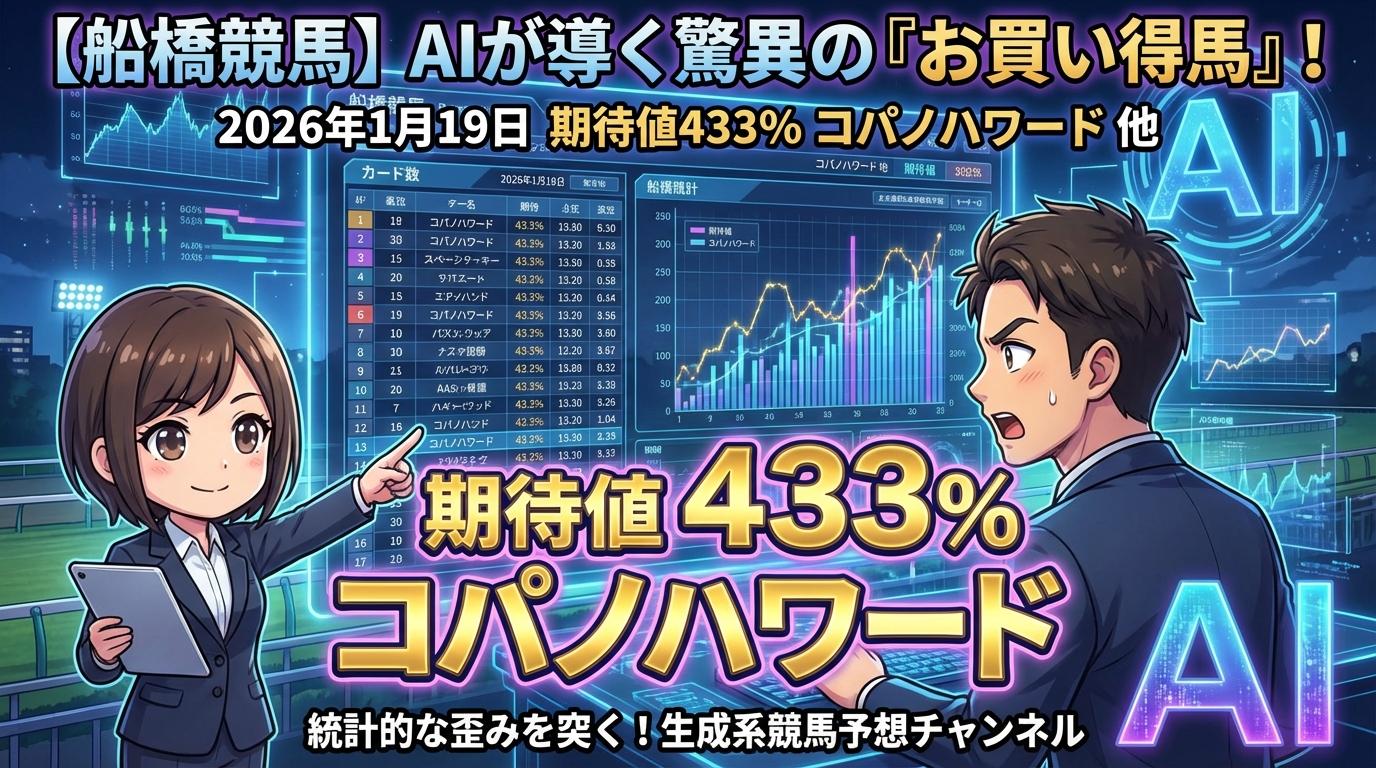 2026年1月19日開催の船橋競馬を、AIが独自の視点で徹底解析。冬季のトラックバイアスやコースの物理的特性を読み解き、市場オッズとの乖離が大きい「投資価値の高い馬」を4頭抽出しました。期待値300%超えのミヤビモルタル、シャルパンティエ、コパノハワード、グランピクニックの勝算に迫ります。