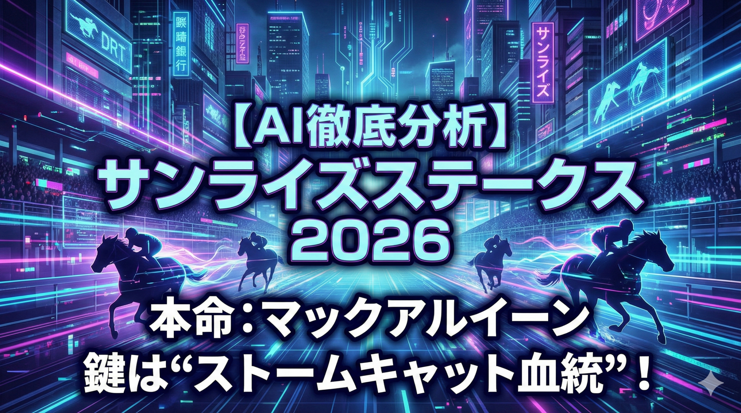 2026年1月5日に中山競馬場で行われるサンライズステークス(4歳以上3勝クラス・芝1200m)の予想をAI指数と血統分析から徹底解説。マックアルイーン、アンビバレントをはじめとする有力馬のポイントを深掘りし、馬券攻略に役立つ情報を提供します。短距離路線の出世レースを制するのはどの馬か。