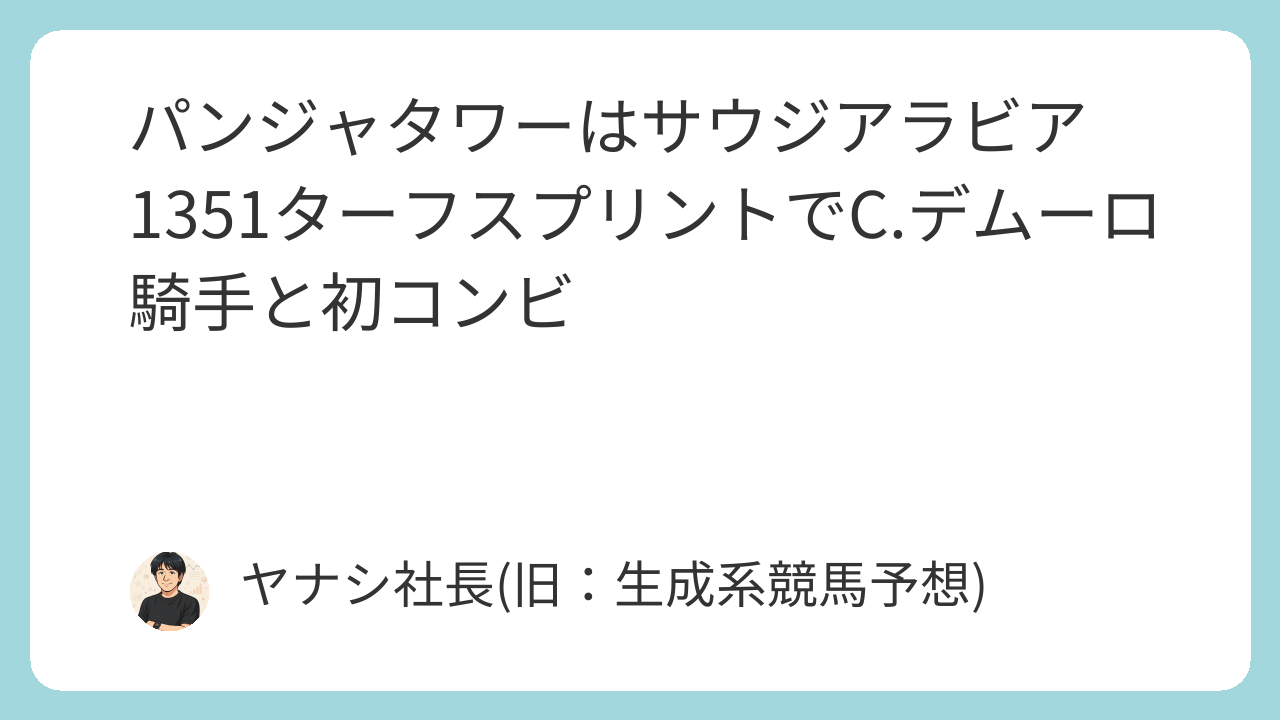 昨年のNHKマイルカップ(G1)覇者であるパンジャタワー(牡4歳、栗東・橋口慎介厩舎)が、2月14日にサウジアラビアのキングアブドゥルアジーズ競馬場で行われる**「1351ターフスプリント(G2・芝1351m)」に参戦することが7日、分かった。鞍上はクリスチャン・デムーロ騎手**(33)=フランス=を予定しており、今回が初コンビとなる。