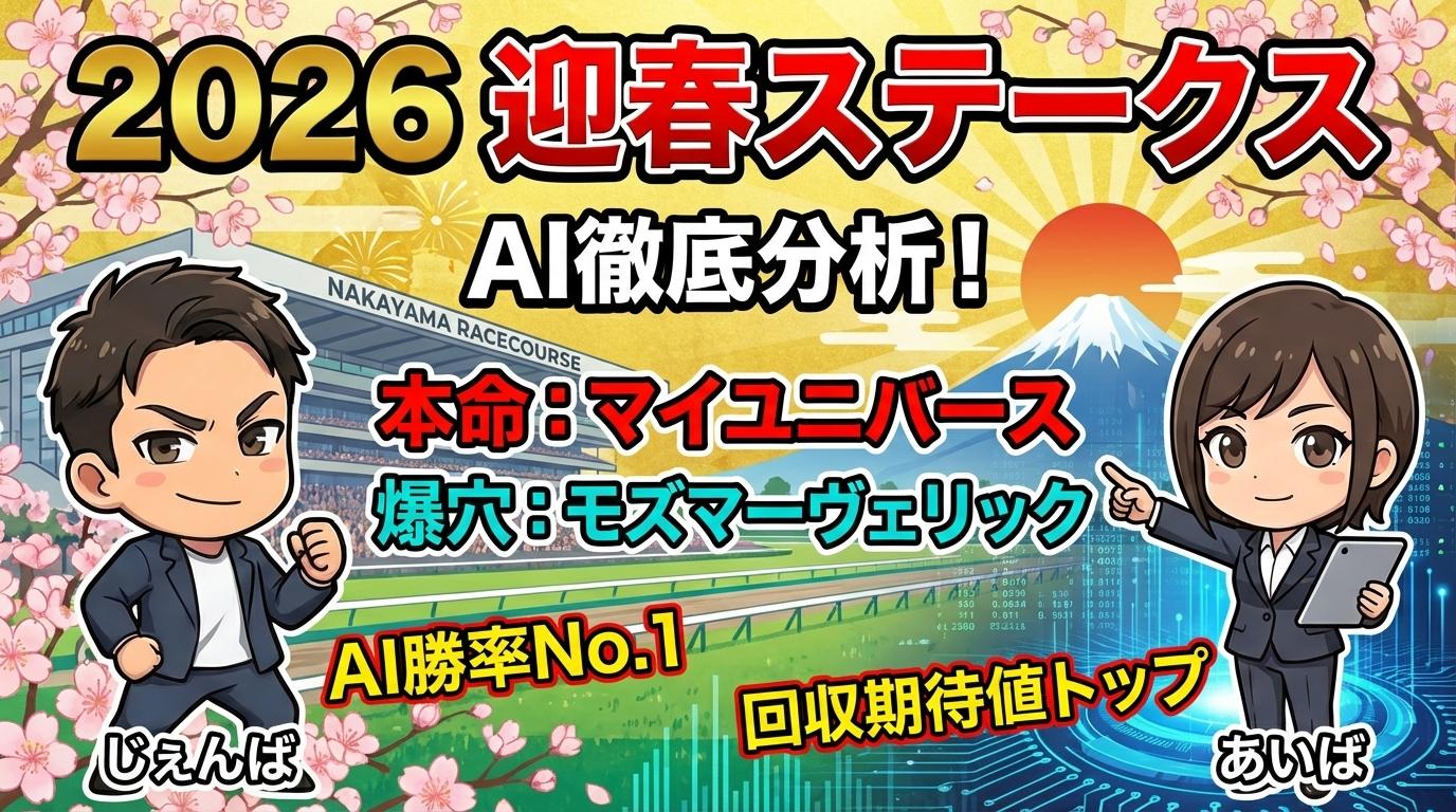 2026年1月10日(土)中山競馬場で行われる迎春ステークス(3勝クラス・芝2200m)について、AIが指名した激走候補モズマーヴェリックと中心馬マイユニバースを中心に、有力馬の血統背景やコース適性を分析。馬券攻略のヒントをお届けします。