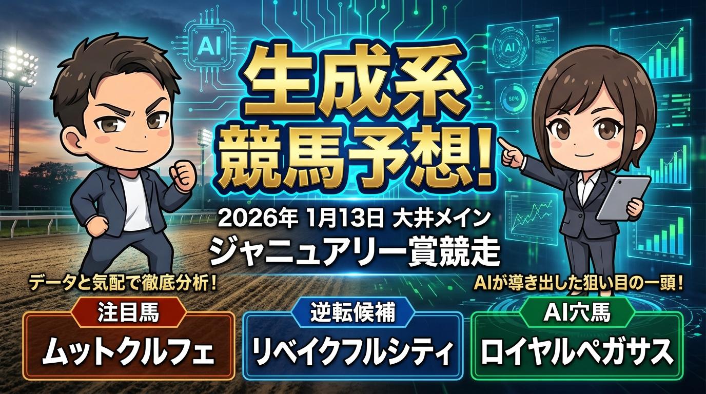2026年1月13日開催のジャニュアリー賞競走(A2B1)は、大井競馬場1800mの実力馬揃いの一戦。有力馬ムットクルフェ、リベイクフルシティ、穴馬ロイヤルペガサスの調教内容や血統背景を深掘りし、レース攻略のポイントを徹底解説します。