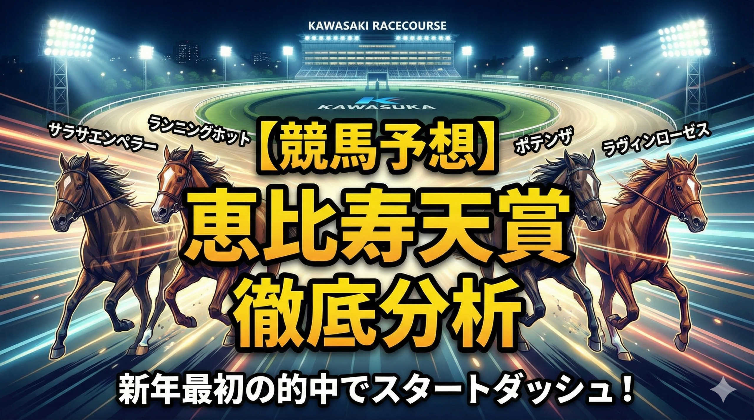 2026年1月3日に川崎競馬場で開催される「恵比寿天賞(C1)」のレース展望。年末年始の変則的な調整過程が鍵を握る中、安定感のあるサラサエンペラーや実績馬ランニングホットなど、有力各馬の血統、近況、調教内容から仕上がり具合を分析し、予想のポイントを解説します。