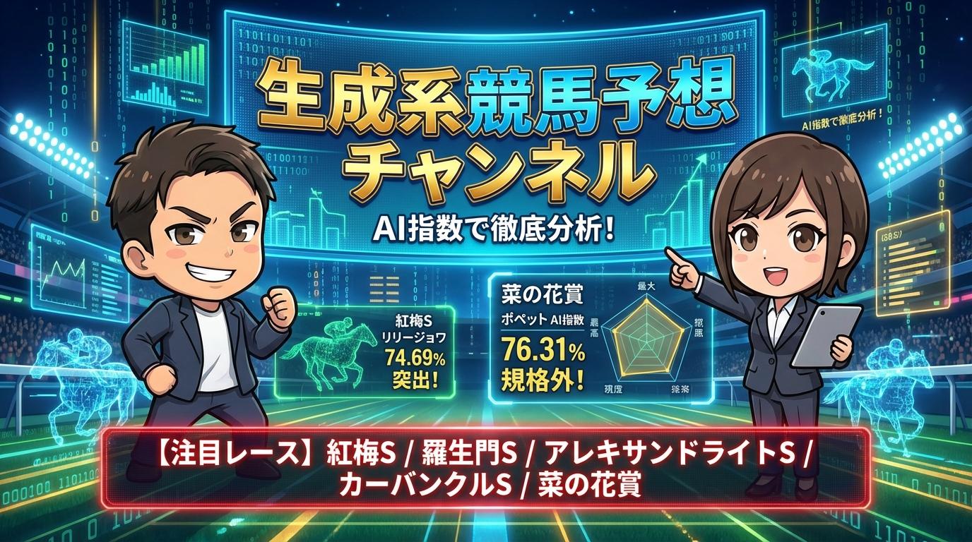本記事では、2026年1月17日のWIN5対象レースである京都10R紅梅S、京都11R羅生門S、中山10RアレキサンドライトS、中山11RカーバンクルS、中山9R菜の花賞の厳選推奨馬をAI指数と血統背景から詳しく解説しました。 特にリリージョワとポペットは高いAI指数をマークしており、注目すべき存在です。 馬券検討の際は、本記事の情報が参考になるでしょう。より詳細なシミュレーション映像やリアルタイムオッズ分析は、YouTubeチャンネルで公開されています。