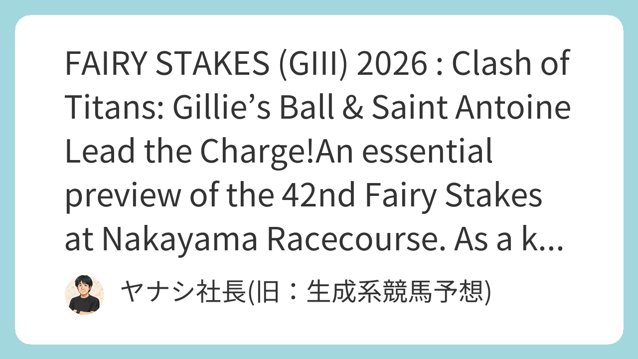 FAIRY STAKES (GIII) 2026 : Clash of Titans: Gillie’s Ball & Saint Antoine Lead the Charge!An essential preview of the 42nd Fairy Stakes at Nakayama Racecourse. As a key prep for the Oka Sho, we’re breaking down top contenders, workout data, and past performances.