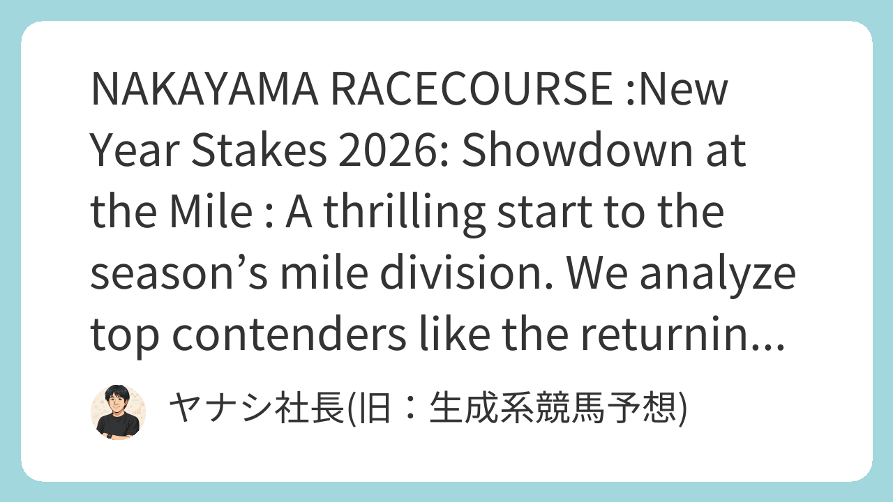 The New Year Stakes 2026 will be held on the Nakayama 1600m turf (Outer). With a firm track expected, speed will be a key factor. A slow pace is predicted, favoring front-runners and horses with a sharp turn of foot.